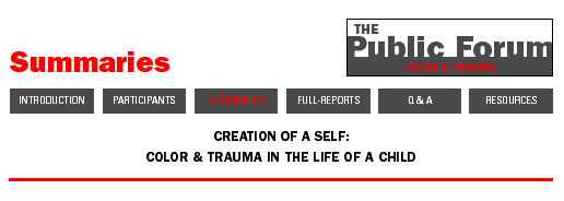 Dr. Johnson-Powell gave personal vignettes of growing up in a segregated Boston, and trying to find her identity at Boston Latin school, were she, as an African &endash;American, was "invisible" to her white classmates. She stated, " I retreated to a closet and buried myself in the books to avoid the pangs of rejection that came with not being invited to after school events. I learned to live in two worlds, fortunately or unfortunately. I became a hybrid person- the hybridization that occurs for kids trying to develop in a culture where ' white is right, brown can stay around, and if you're black, step back'. Dr. Johnson-Powell also told of experiencing trauma from within her family. Her aunt noticed her "bookish ways" and in a classic case of "identification with the aggressor", repeated the view of the dominant culture ,where "black" is "bad" and "white" is "good", and called Dr. Powell 'my little white girl.' Dr. Powell's confusion in her new nickname was compounded by the fact she considers herself to be very dark skinned. The trauma didn't end there. Dr. Powell's siblings, who were all talented in their own right, envied the attention she got from the aunt, and ostracized and tormented her. Eventually, her mother banned the nickname. Dr. Johnson-Powell stressed the need to understand the context of an individual's background, in order to best be able to help her.